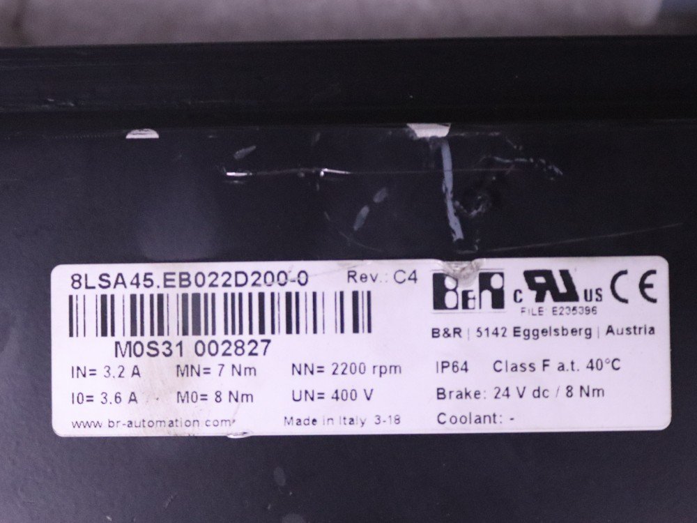 A B&R 8LSA45 servomotor with an 8 Nm continuous stall torque, a 5:1 gearbox, and an integrated 8 Nm brake.