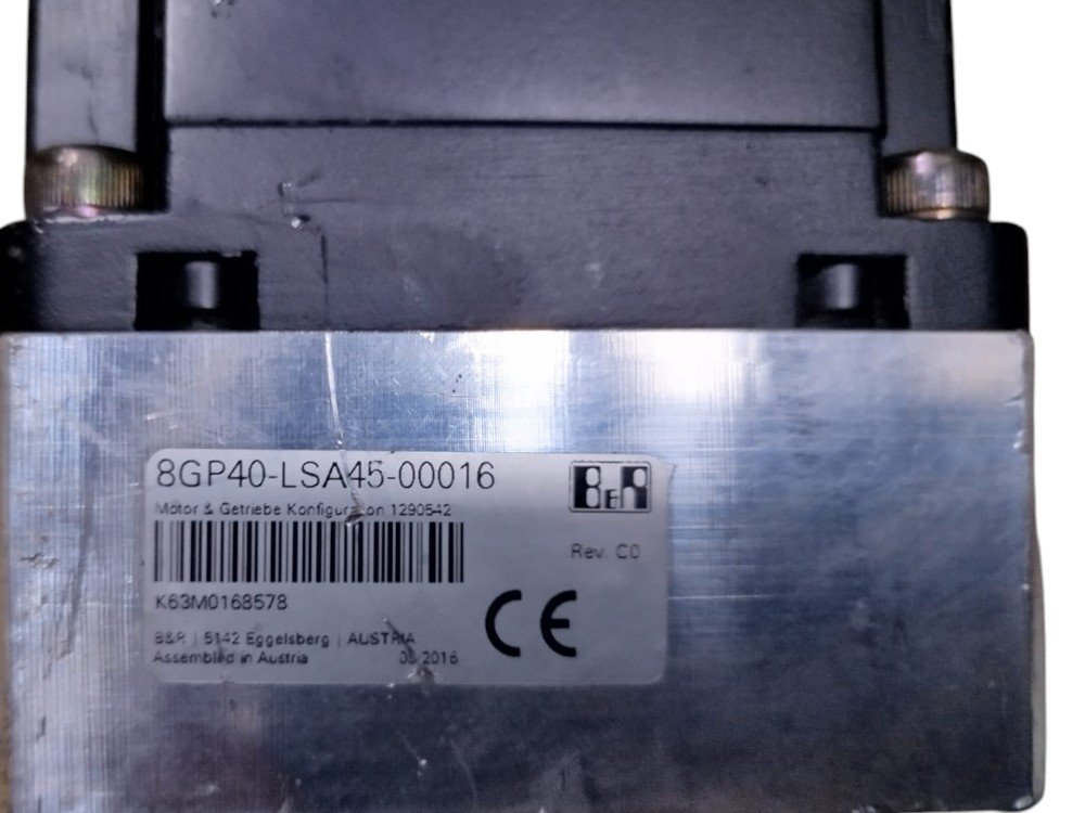 This product is a combination of a synchronous servomotor, a planetary gearbox, and an integrated brake. The B&R 8LSA45.EB022D200-0 motor is a powerful servomotor known for its precision and dynamic performance. It is paired with a B&R 8GP-080-005S2L4 planetary gearbox, which is a precision gearbox known for its high efficiency and low backlash. The 5:1 ratio of the gearbox effectively reduces the motor’s high speed while multiplying the output torque, enabling the assembly to drive heavy loads with high precision. An integrated brake with a torque of 8 Nm is included, providing an essential safety feature for holding loads when power is off. This geared motor assembly is a robust solution for applications where a compact design is necessary, and where both speed and torque are required for accurate motion.