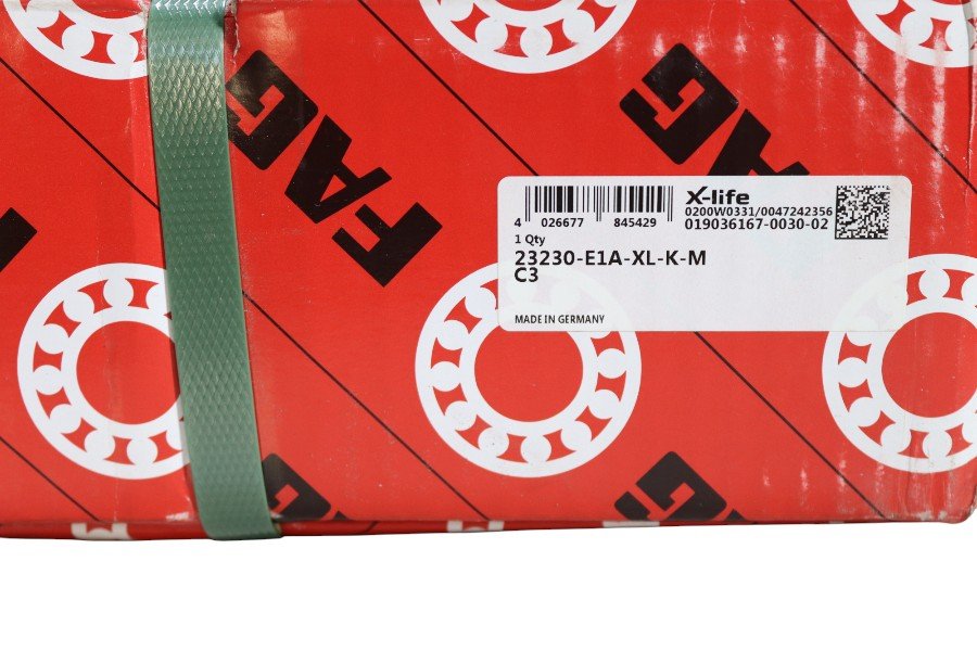 The FAG 23230-E1A-XL-K-M C3 is a high-performance spherical roller bearing designed to handle very heavy radial and axial loads. As part of the premium “X-life” series, it features a robust self-aligning design that compensates for shaft misalignment, a solid brass cage for durability, and a larger-than-normal C3 internal clearance. The tapered bore allows for secure mounting on a cylindrical shaft using an adapter sleeve, making it a reliable choice for demanding applications.