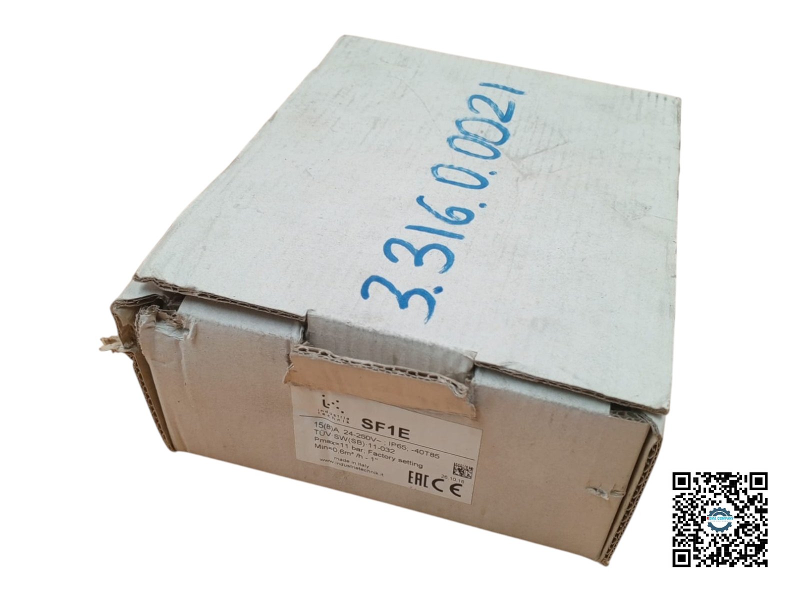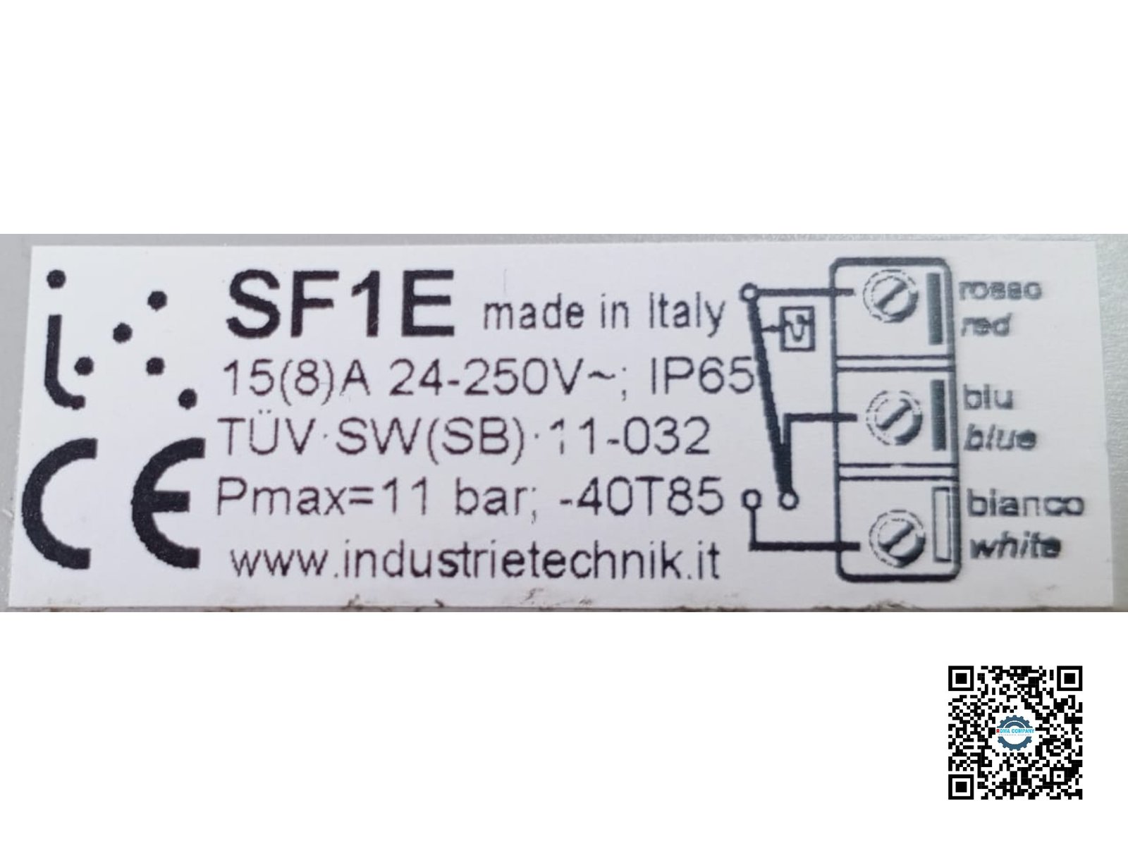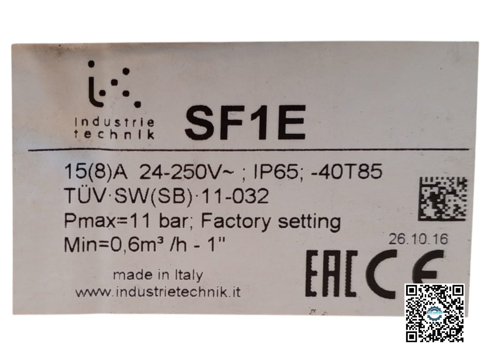 An Industrie Technik SF1E is a flow switch with an electrical rating of 15(8)A, a max pressure of 11 bar, and a minimum flow of 0.6 m³/h.