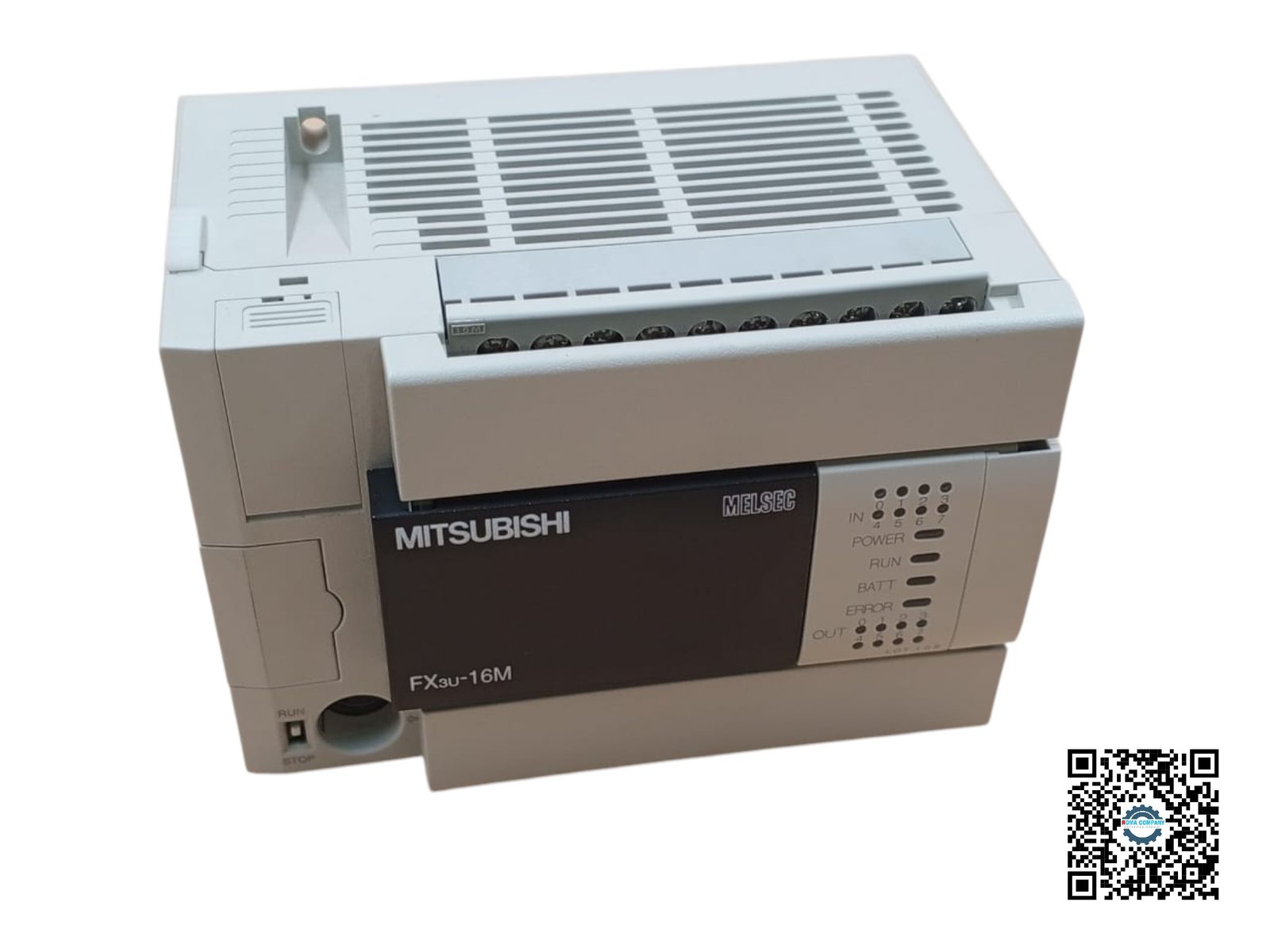 A Mitsubishi FX3U-16MT/DSS is a compact PLC with 16 transistor I/O points, a 24 V DC power supply, and a max output current of 0.5 A.