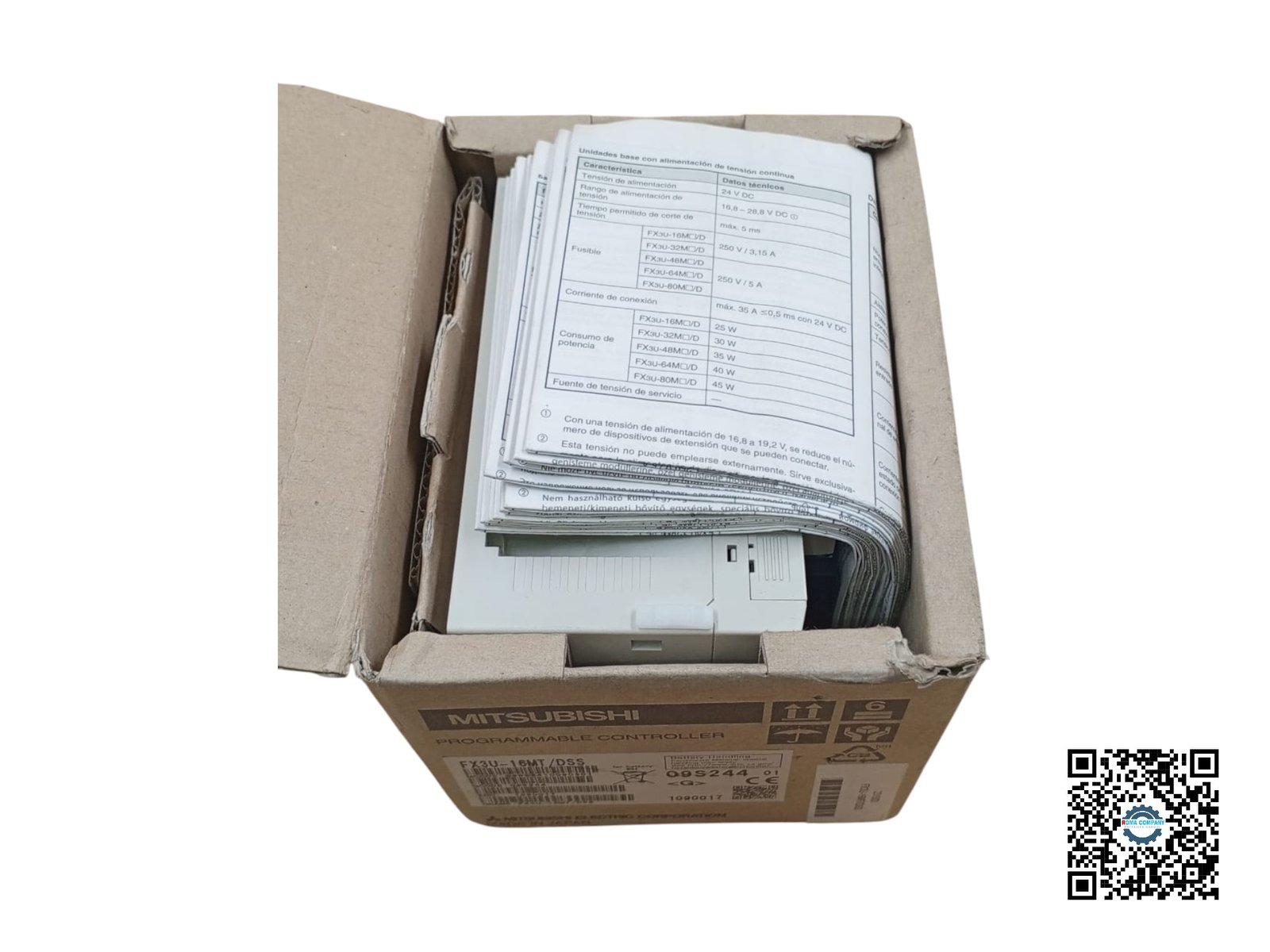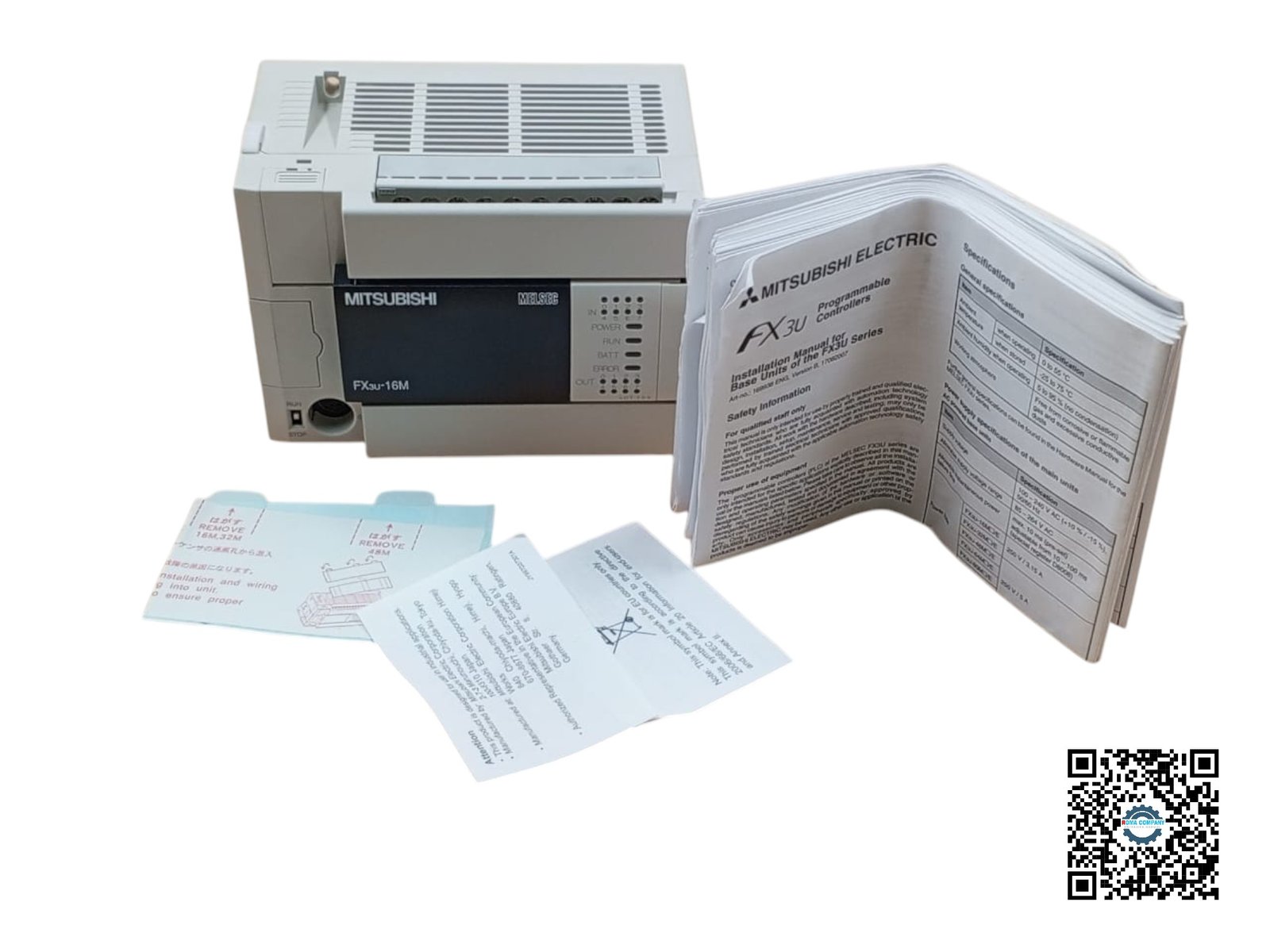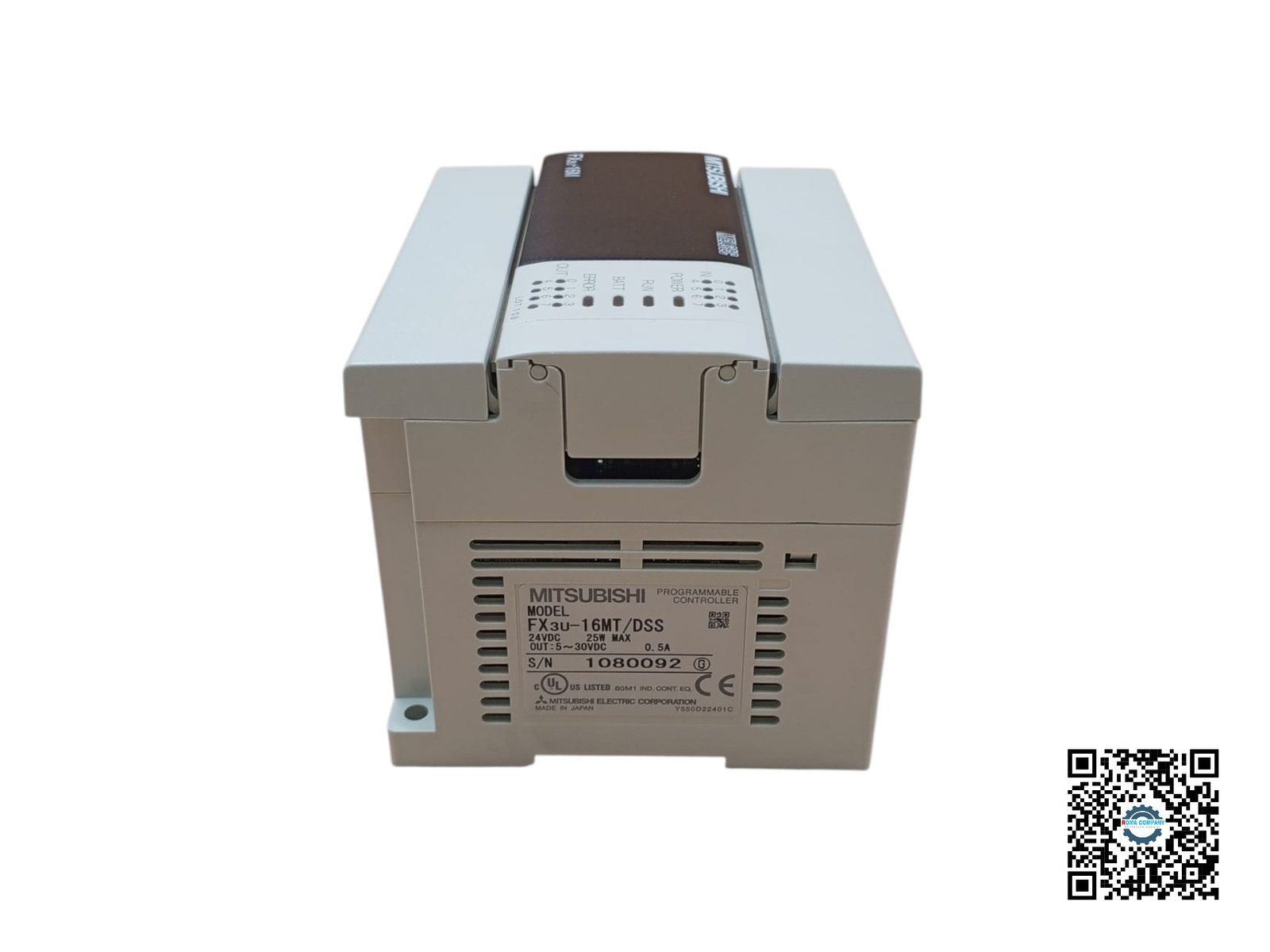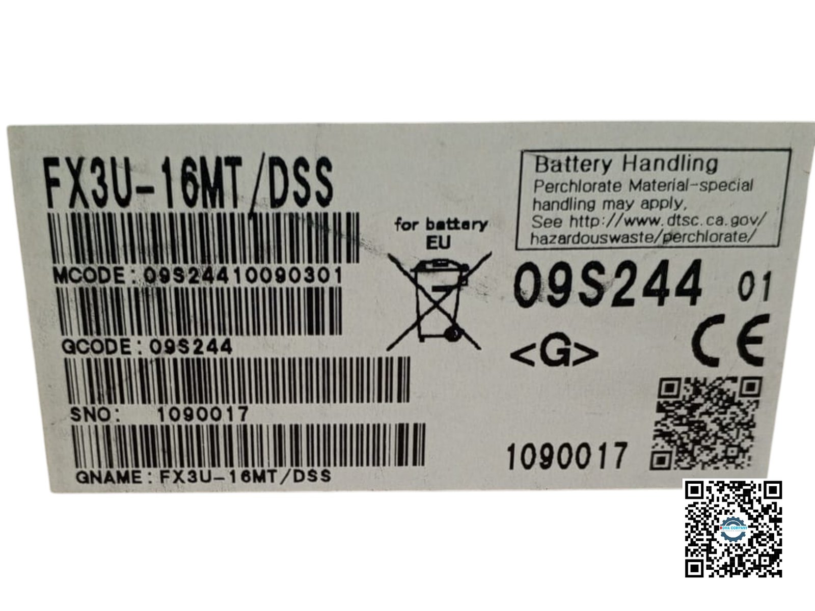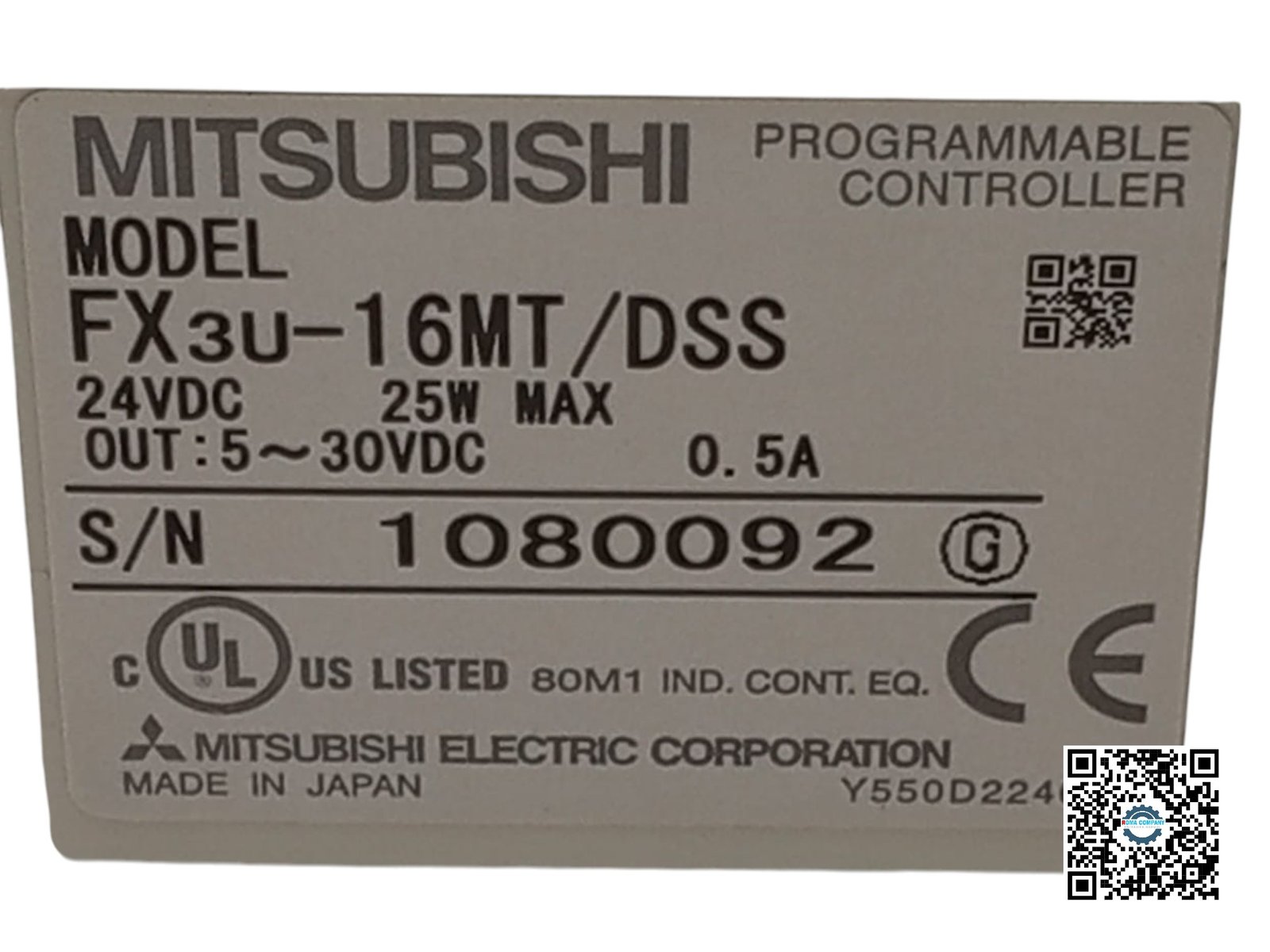 The Mitsubishi Electric FX3U-16MT/DSS is a compact PLC used for automation and control of industrial processes and machinery. The “16” in the model name indicates that the PLC has a total of 16 inputs and outputs. The “MT” specifies that the outputs are transistor outputs, which are suitable for high-speed switching applications. The controller operates on 24 V DC with a maximum power consumption of 25 W. The output is rated for 5 to 30 V DC at a maximum current of 0.5 A. One of the labels includes a battery handling warning for perchlorate material, with a link to a website for special handling instructions.