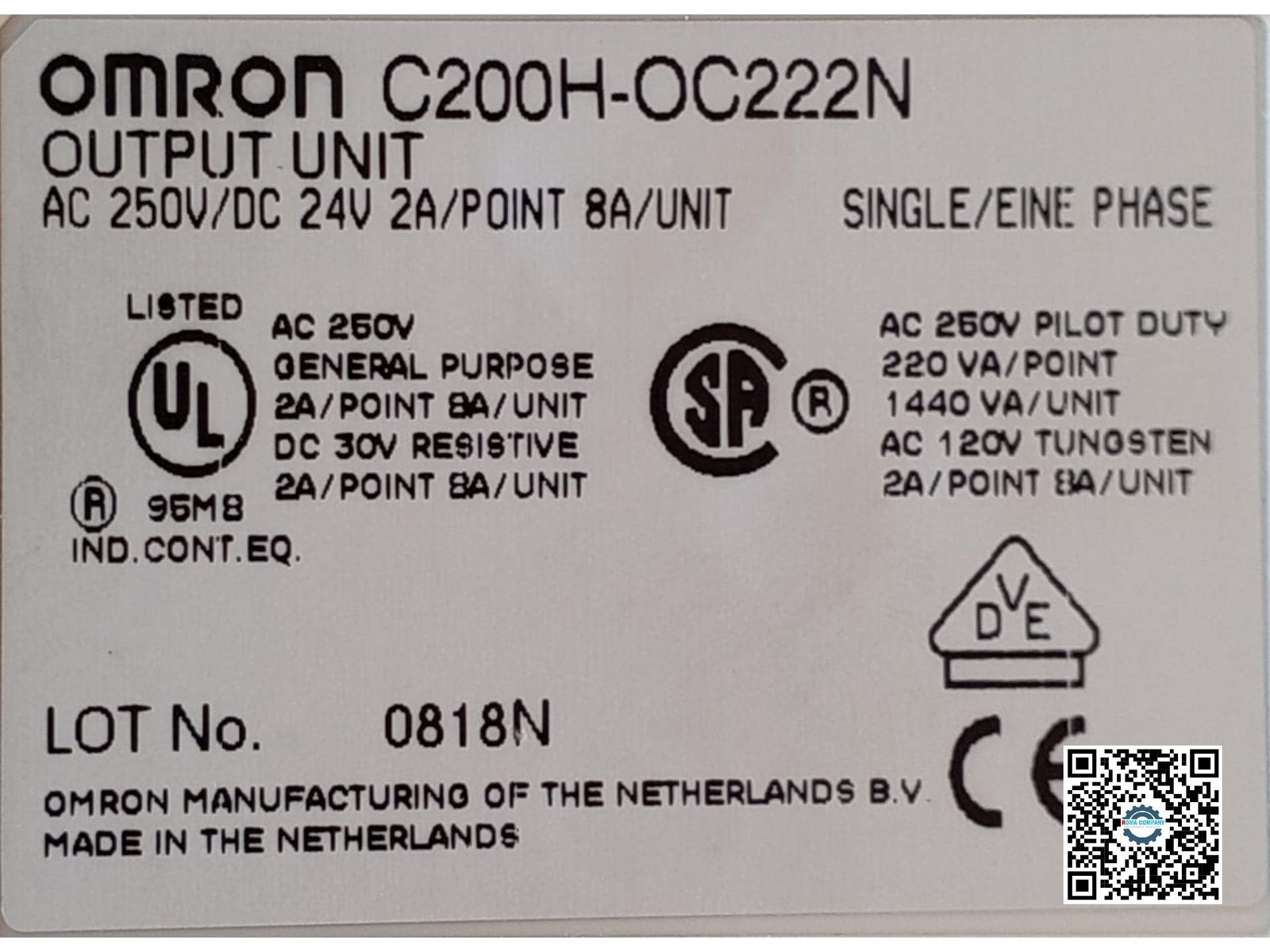 An OMRON C200H-OC222N is a 16-point relay output unit for the C200H programmable controller, rated for AC250V and DC24V.