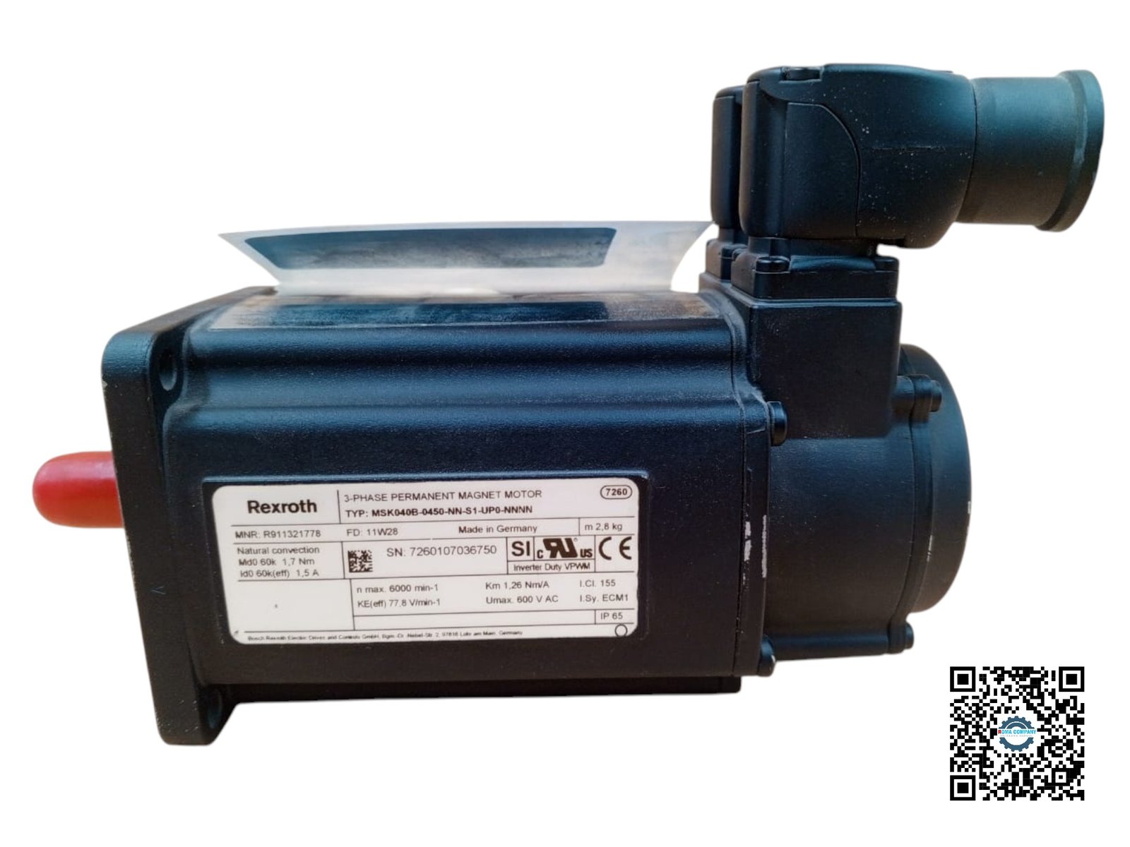 A Rexroth MSK040B-0450-NN-S1-UP0-NNNN is a 3-phase synchronous servo motor with a 1.7 Nm rated torque, a max speed of 6000 RPM, and an IP65 rating.