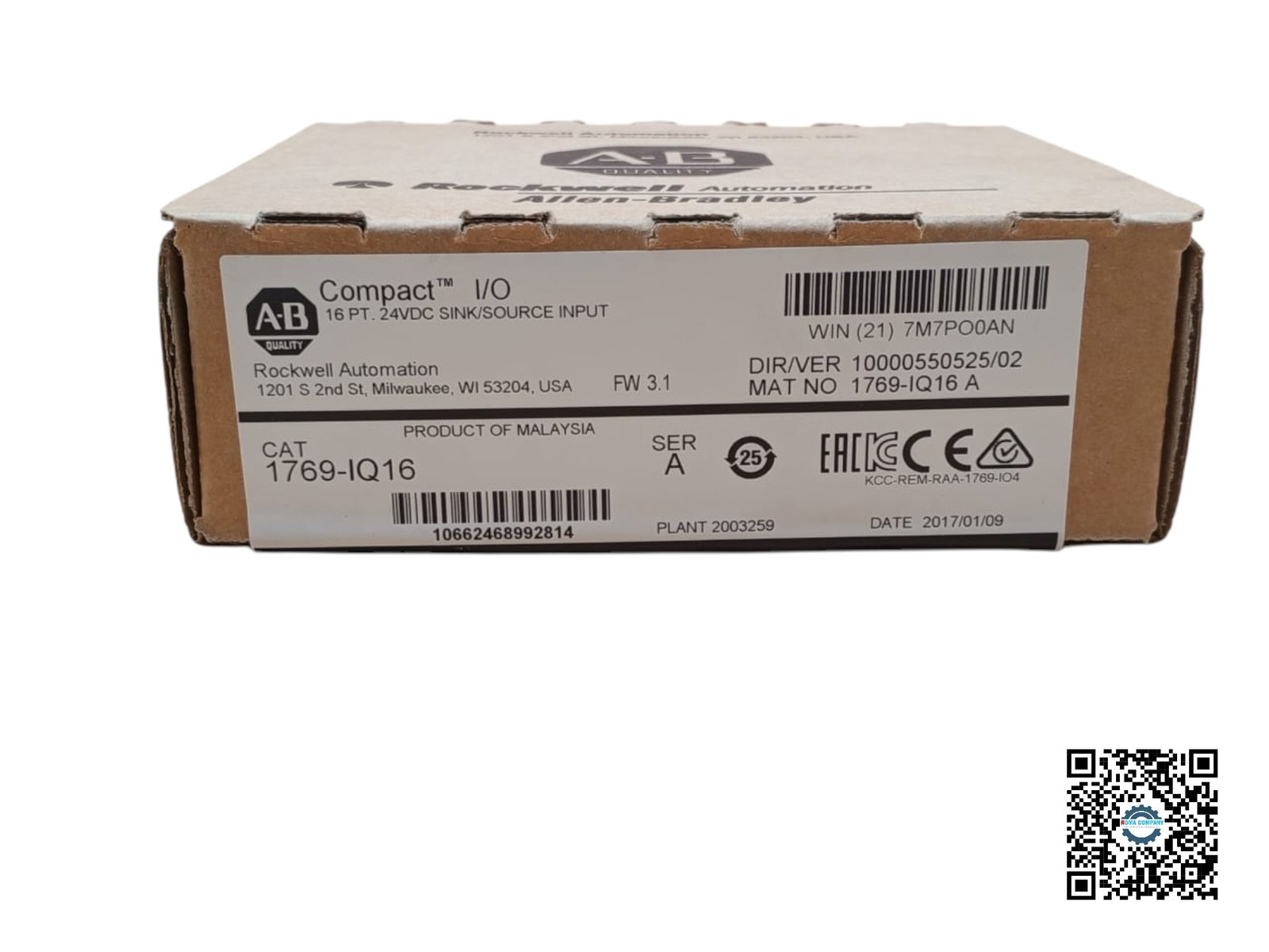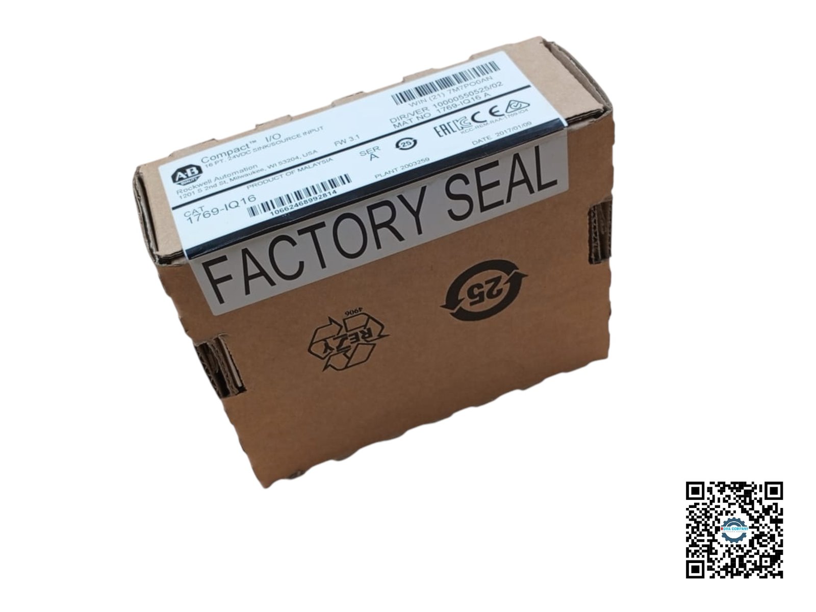 A Rockwell Automation 1769-IQ16 is a 16-point digital input module for CompactLogix controllers, accepting 10-30VDC sink/source signals.